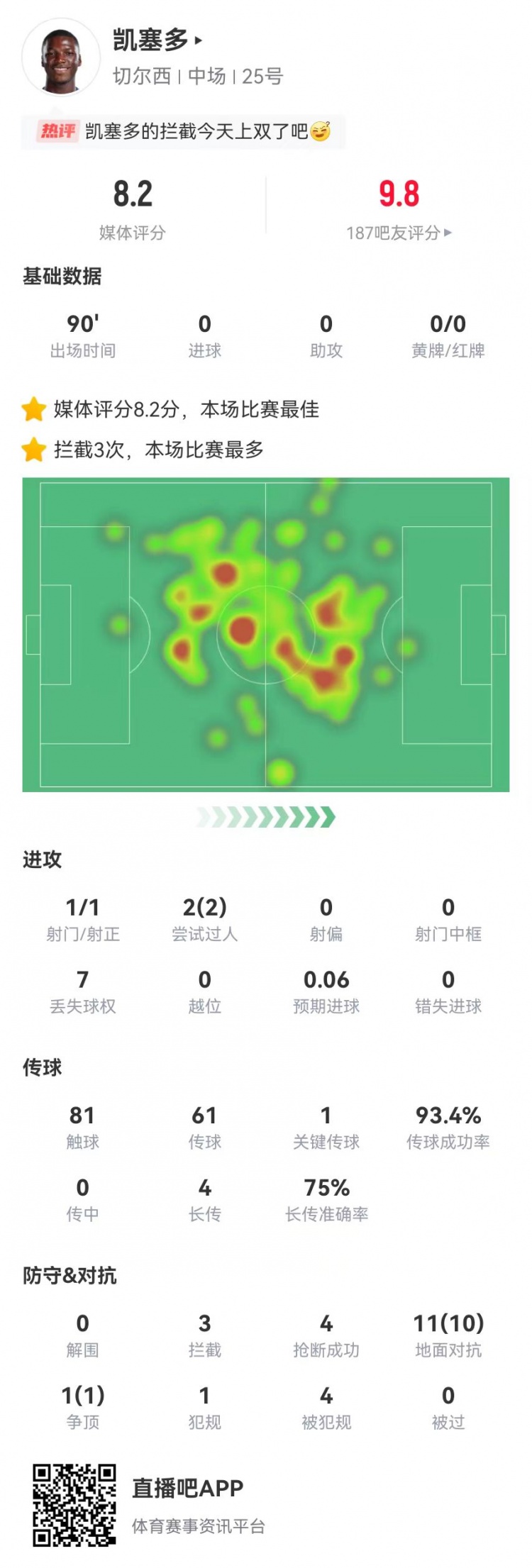 3月10日訊 切爾西在本輪英超1-0力克萊斯特城,凱塞多本場(chǎng)數(shù)據(jù)如下: