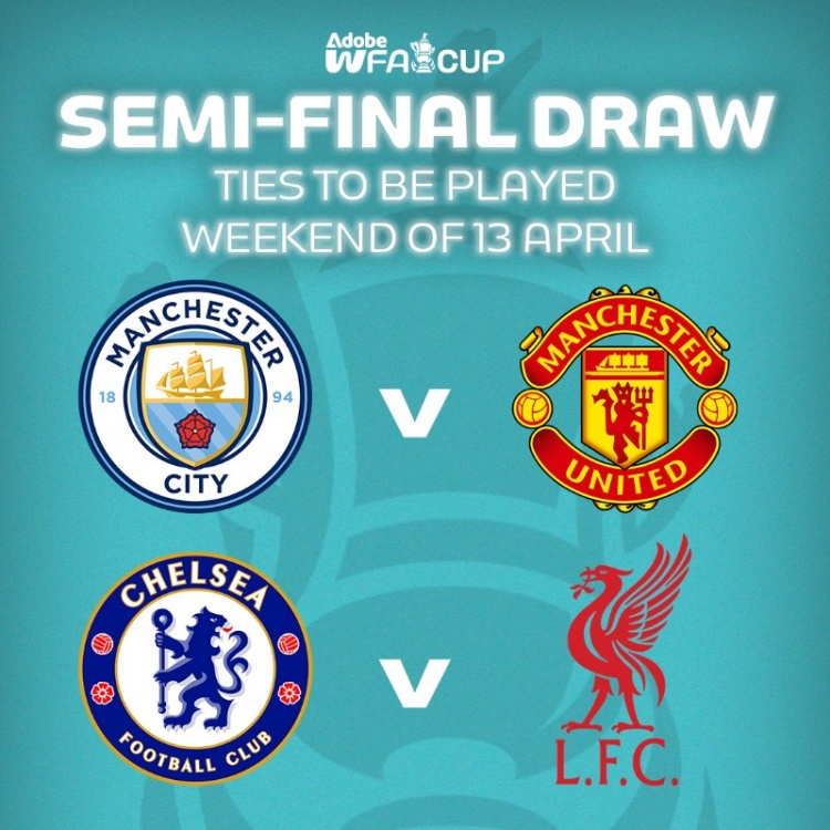 經(jīng)過抽簽,女足足總杯半決賽對陣為曼城vs曼聯(lián)、切爾西vs利物浦,比賽將于4月13日的那個周末進(jìn)行。