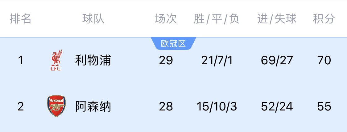 若4月27日利物浦迎戰(zhàn)熱刺前,利物浦仍領(lǐng)先15分,那么這場比賽紅軍只要確保不敗,即可提前4輪奪冠。