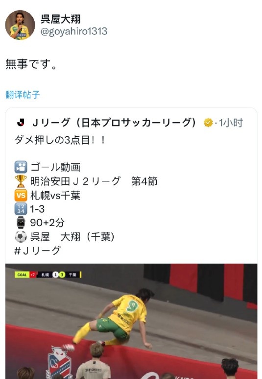 好在經(jīng)過一番檢查,吳屋大翔并無大礙,并回到球場繼續(xù)比賽,比賽結束后,吳屋大翔也轉發(fā)了自己“出糗”視頻,并寫道“平安無事。”,再次讓球迷們安心。