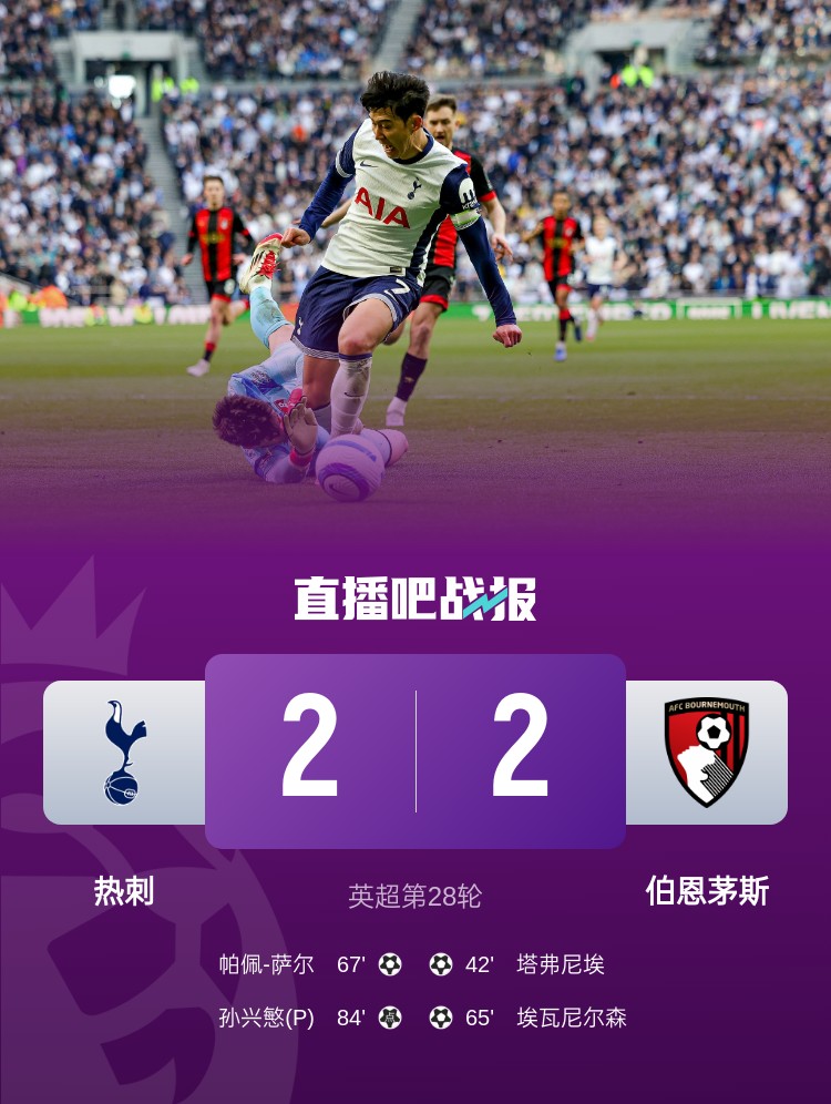 熱刺2-2戰(zhàn)平伯恩茅斯,薩爾、孫興慜破門,熱刺未能主場(chǎng)全取3分。