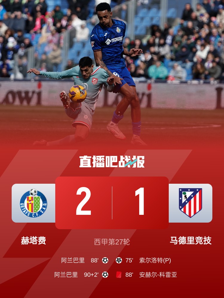 馬競(jìng)1-2不敵赫塔費(fèi),科雷亞第88分鐘染紅,馬競(jìng)錯(cuò)失登頂機(jī)會(huì)!