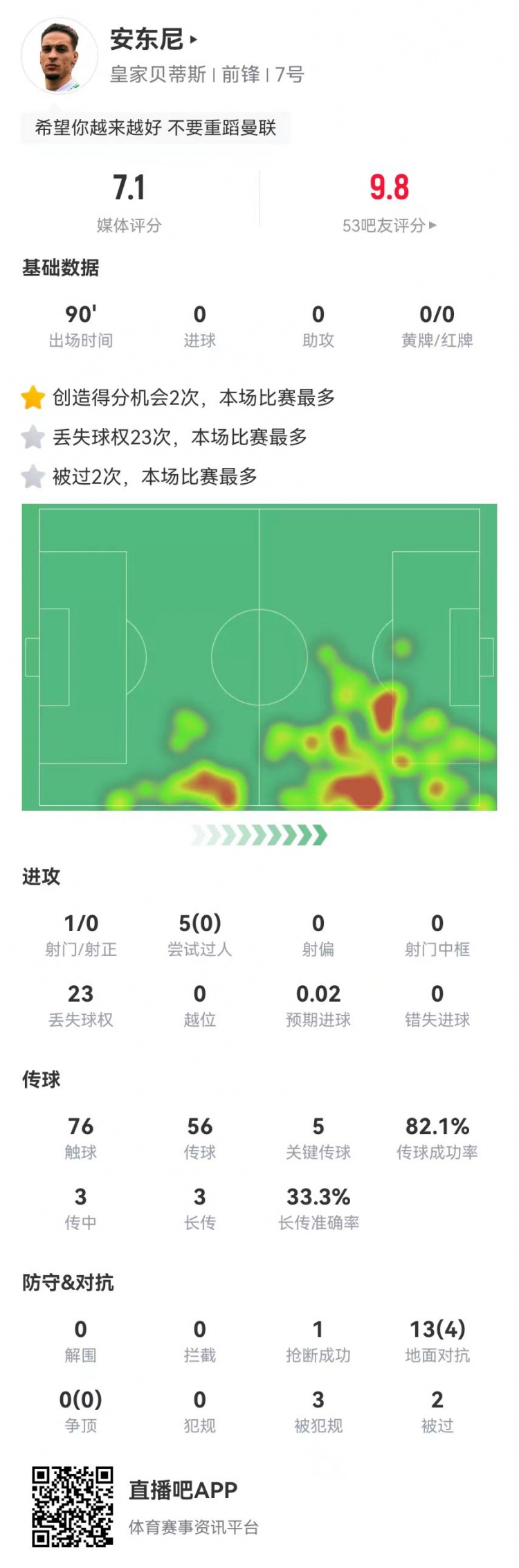 3月10日訊 貝蒂斯在本輪西甲1-0小勝拉斯帕爾馬斯,曼聯(lián)租將安東尼本場(chǎng)數(shù)據(jù)如下: