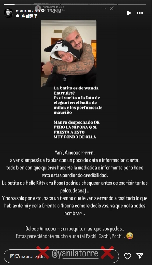 伊卡爾迪寫道:雅尼(下圖右邊為伊卡爾迪說的 Yanina Latorre),你想成為一名媒體人、消息人士,這很好,但用事實(shí)和證據(jù)說話。你正在失去信譽(yù),Hello Kitty的睡衣是粉色的,寫這么多之前你能檢查下嗎?