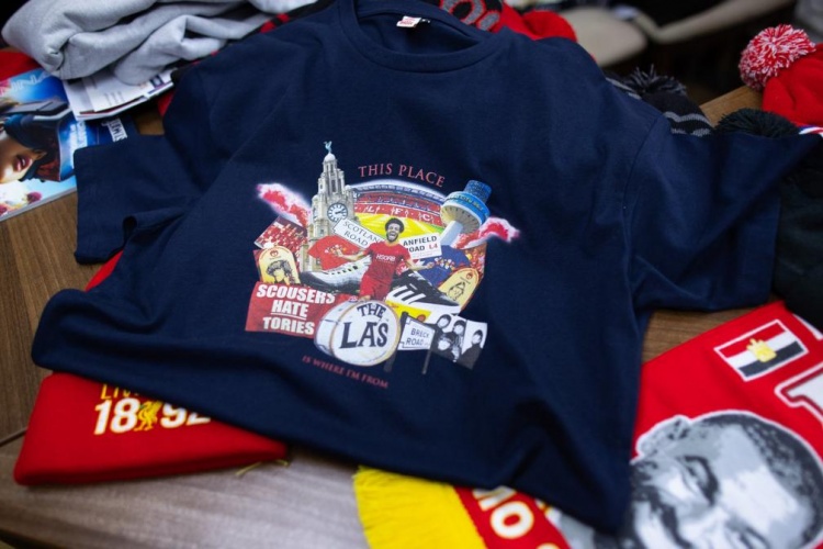 在距離利物浦主場安菲爾德只有5分鐘步行路程的一家商店里,你可以看到當(dāng)?shù)卣诔鍪垡患?0鎊的T恤,上面印有目前利物浦這座城市的標(biāo)志:樂隊(duì)披頭士和The La's、地標(biāo)性建筑皇家利物大廈和利物浦電臺城塔,以及薩拉赫。