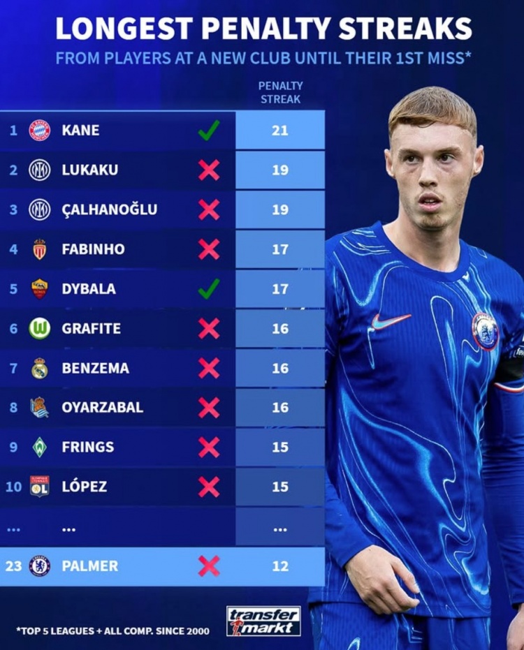 《轉(zhuǎn)會市場》統(tǒng)計了新世紀(jì)以來五大聯(lián)賽球員在新東家在不罰丟情況下連續(xù)命中點(diǎn)球紀(jì)錄,凱恩21球居首并且仍未罰丟。