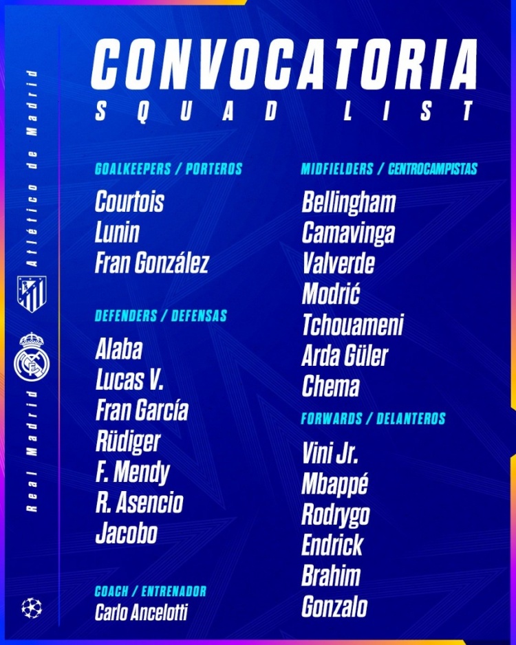 皇馬本場比賽大名單如下: