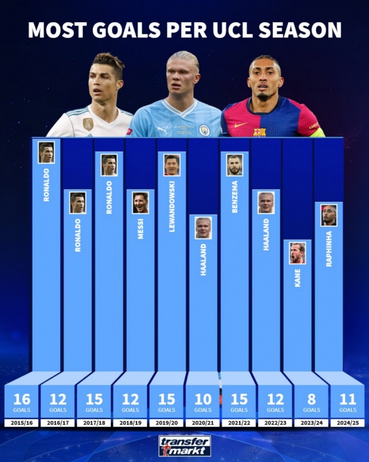 3月12日訊 本賽季拉菲尼亞狀態(tài)出色,目前在歐冠賽場以11粒進球領跑射手榜。德轉(zhuǎn)也盤點了近10年歐冠單賽季最多進球紀錄,具體如下: