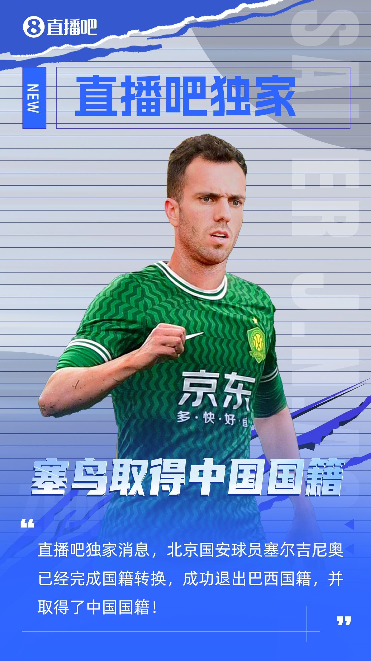 03月12日訊 獨(dú)家消息,北京國(guó)安球員塞爾吉尼奧已經(jīng)完成國(guó)籍轉(zhuǎn)換,成功退出巴西國(guó)籍,并取得中國(guó)國(guó)籍。