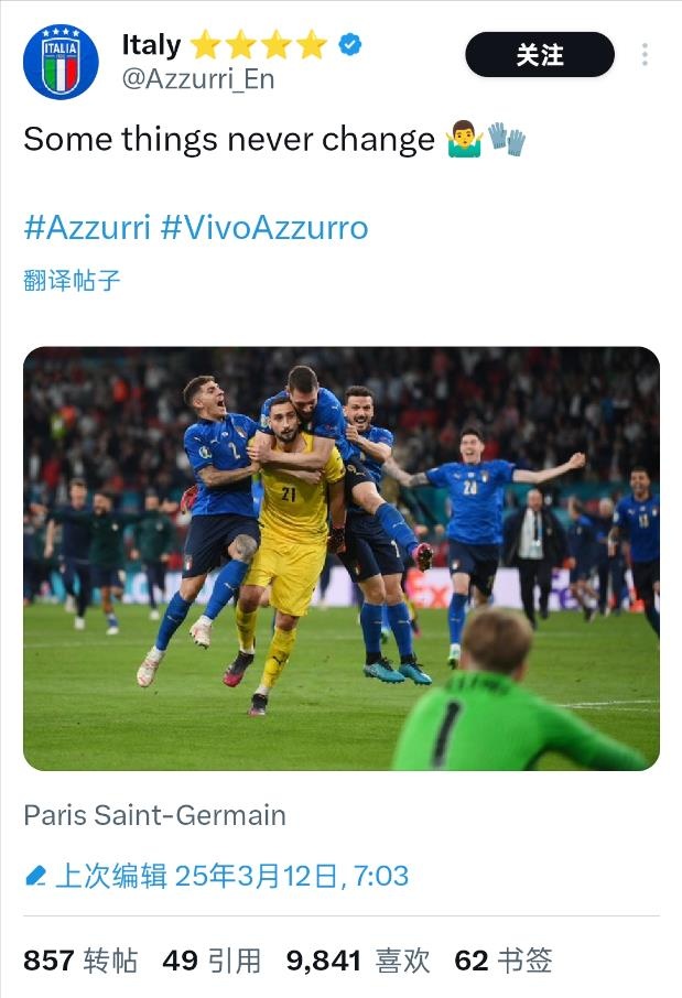 賽后,意大利國家隊官推曬出了2020歐洲杯決賽多納魯馬撲出決勝點球的瞬間,并寫道:“有些事情永遠(yuǎn)都不會改變”。當(dāng)時意大利隊與東道主英格蘭隊在決賽戰(zhàn)至點球大戰(zhàn),三獅軍團(tuán)第4、5順位出場的桑喬和薩卡的點球都被多納魯馬擋出,英格蘭隊無緣隊史首座歐洲杯冠軍。繼那屆歐洲杯之后,多納魯馬再次給英格蘭足球送上一記“重?fù)簟薄?/span>
