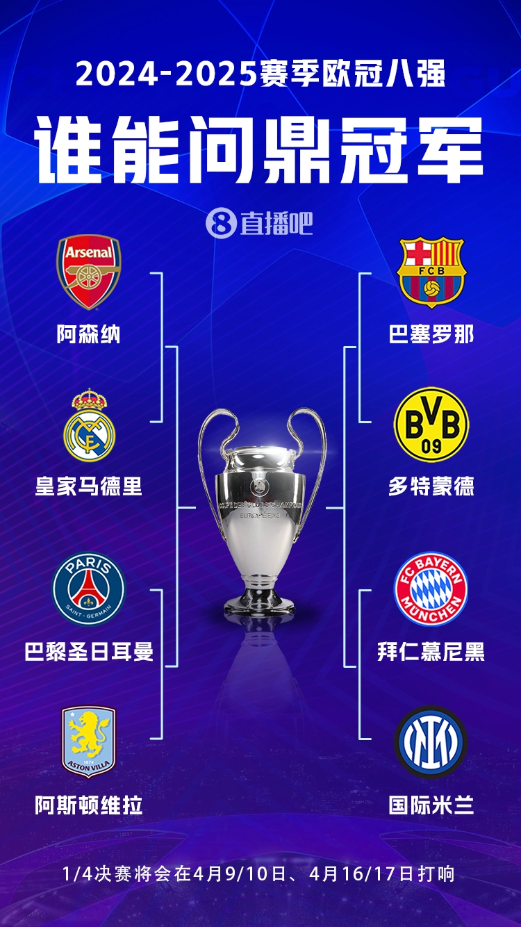 03月13日訊 歐冠8強(qiáng)今天凌晨全部出爐,上半?yún)^(qū)的4強(qiáng)分別是阿森納、皇馬、巴黎和維拉,下半?yún)^(qū)則是巴薩、多特、拜仁和國(guó)米。