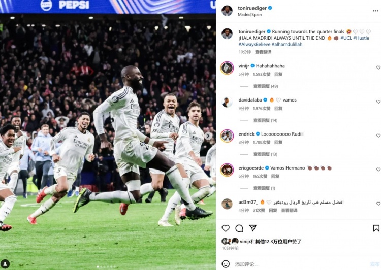 本場比賽呂迪格打進致勝點球,賽后他也在個人社媒曬出全隊瘋狂慶祝照,配文寫道:“沖向歐冠8強,Hala Madrid,永遠(yuǎn)堅持到最后一刻!”