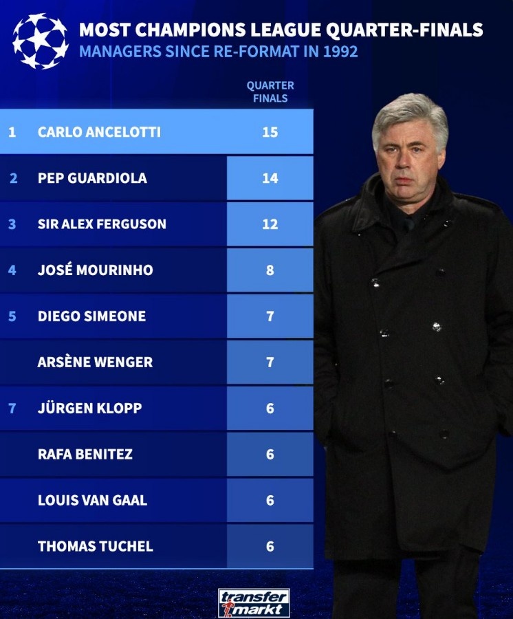 德轉(zhuǎn)也盤點了歐冠改制后主帥率領(lǐng)球隊晉級8強(qiáng)的次數(shù)榜,其中安切洛蒂居首。具體如下: