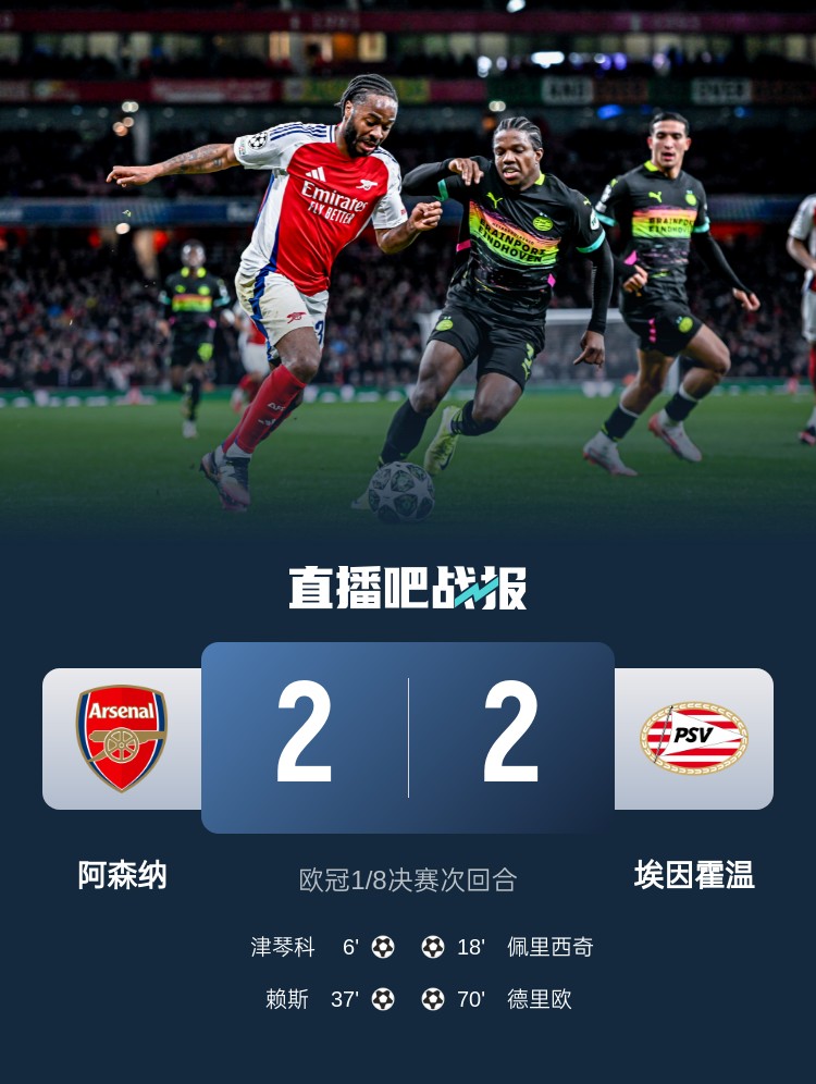 歐冠1/8決賽次回合,阿森納2-2戰(zhàn)平埃因霍溫,總比分9-3晉級(jí)八強(qiáng)。上半場(chǎng),津琴科破門(mén),佩里西奇扳平,賴(lài)斯頭球建功,斯特林送出2次助攻&錯(cuò)失1次單刀球機(jī)會(huì);下半場(chǎng),德里歐挑射破門(mén)。