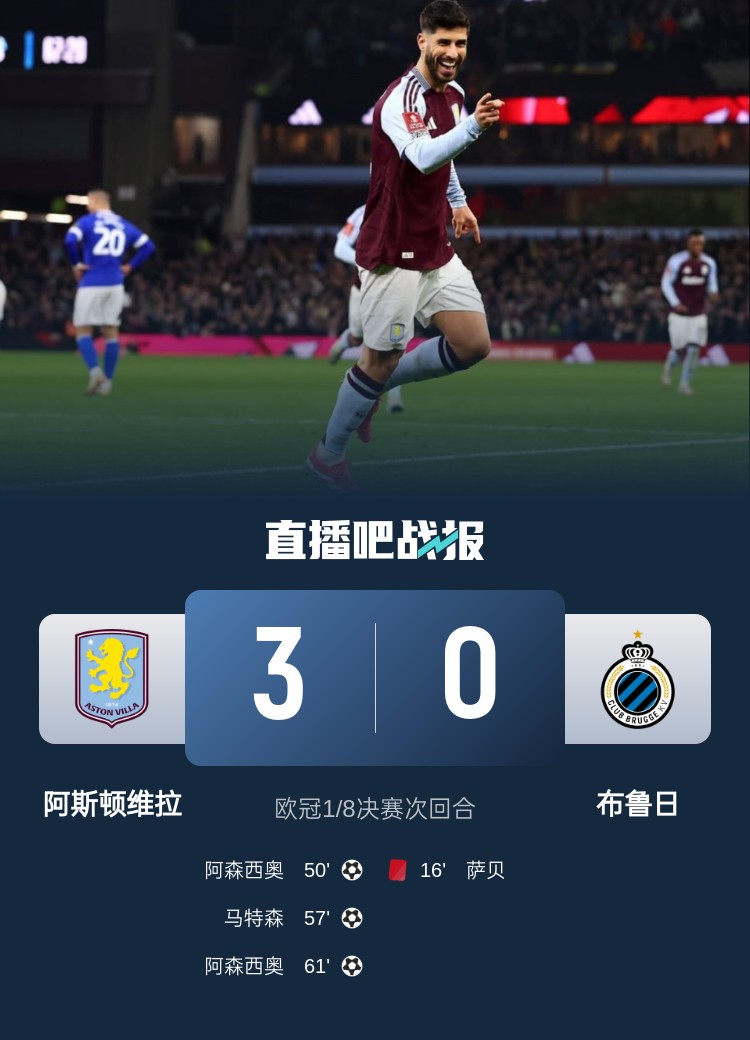 歐冠1/8決賽次回合,維拉3-0擊敗布魯日,總比分6-1晉級(jí)歐冠8強(qiáng)。上半場(chǎng),大馬丁精準(zhǔn)長(zhǎng)傳找到拉什福德,后者制造直紅;下半場(chǎng),阿森西奧替補(bǔ)登場(chǎng)雙響,另有一次中柱,拉什福德貢獻(xiàn)1助攻,馬特森打進(jìn)1球。