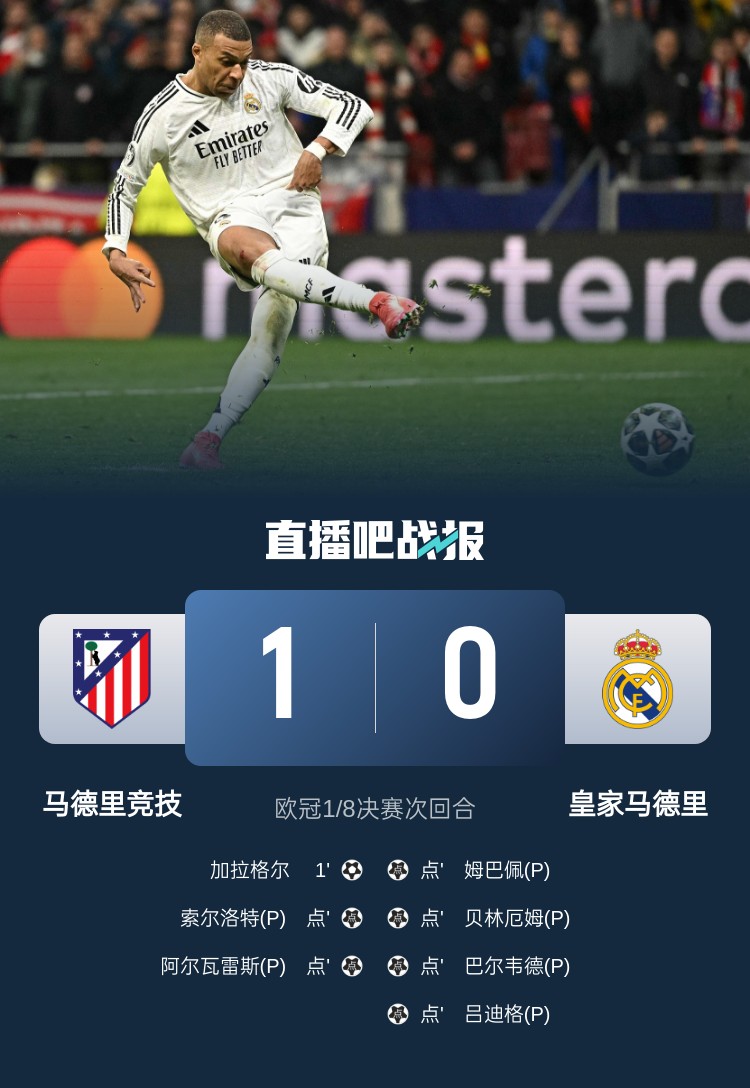 歐冠1/8決賽次回合,皇馬兩回合2-2,點(diǎn)球大戰(zhàn)4-2擊敗馬競(jìng)晉級(jí)歐冠8強(qiáng),將迎戰(zhàn)阿森納。上半場(chǎng),加拉格爾閃擊破門(mén),阿爾瓦雷斯兩次勁射被庫(kù)爾圖瓦撲出;下半場(chǎng),姆巴佩造點(diǎn),維尼修斯主罰打飛;加時(shí)賽,雙方均未制造破門(mén)良機(jī);點(diǎn)球大戰(zhàn),阿爾瓦雷斯滑倒二次觸球進(jìn)球無(wú)效,巴斯克斯主罰被撲,略倫特?fù)糁袡M梁。