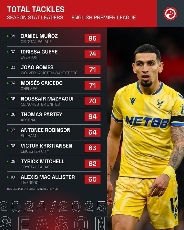 2月4日訊 squawka統(tǒng)計了本賽季英超球員搶斷情況,水晶宮的右后衛(wèi)穆尼奧斯獨(dú)自領(lǐng)跑。