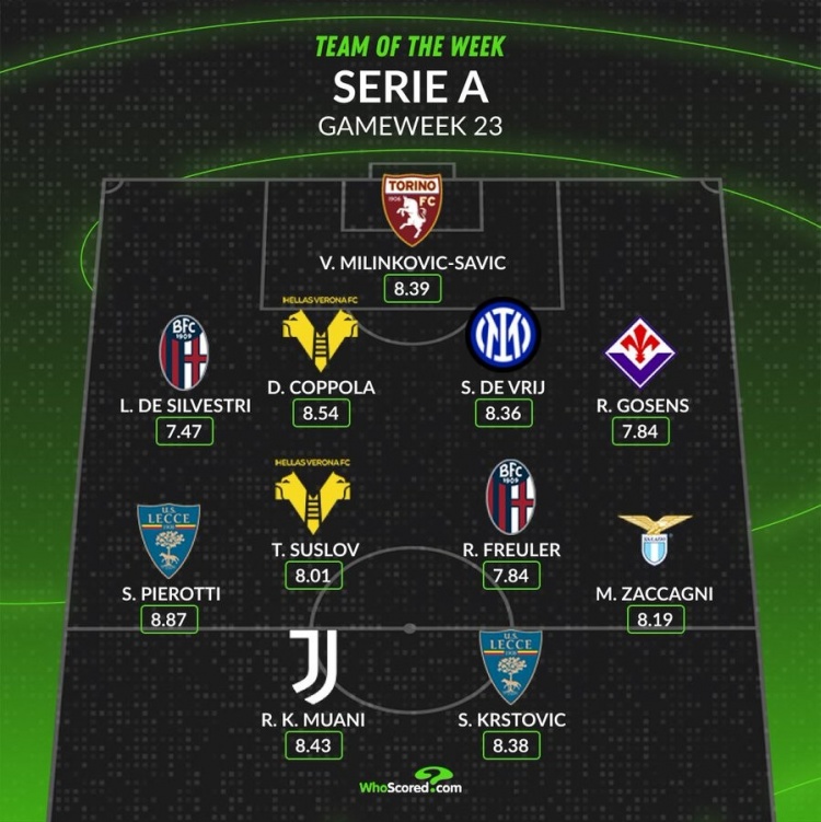 2月4日訊 意甲第23輪已經(jīng)完賽,whoscored也統(tǒng)計(jì)了本輪最佳陣容,穆阿尼、德弗里領(lǐng)銜。