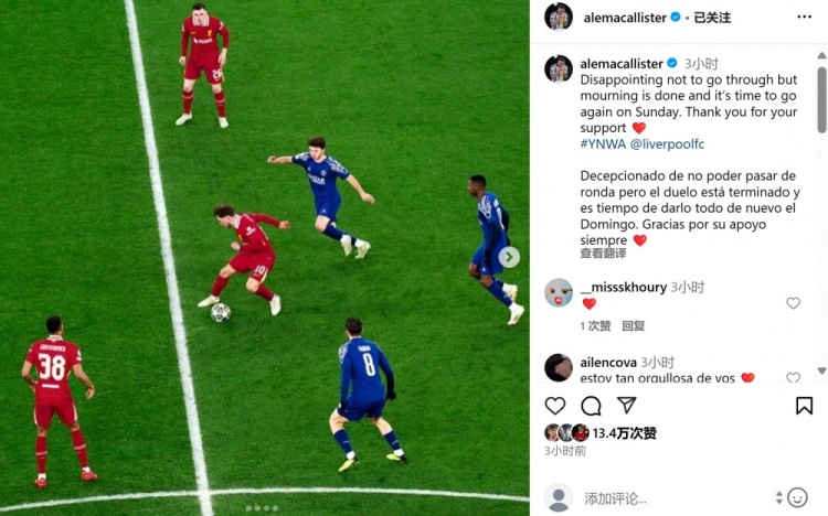 麥卡利斯特在社媒曬出一張面對(duì)巴黎3人合圍的照片,配文寫道:“很失望未能更進(jìn)一步,但是該停止遺憾了,是時(shí)候在周末再次出發(fā)。感謝大家的支持?!?/p>