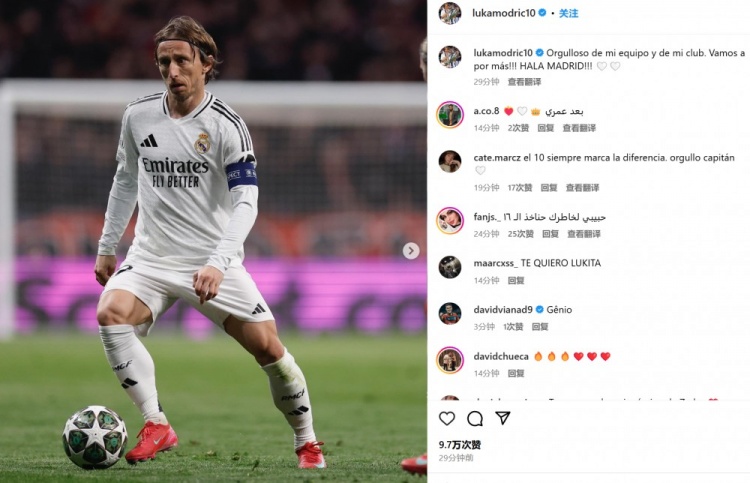 莫德里奇曬出自己的比賽照并配文:“我為我的球隊和俱樂部感到驕傲。讓我們繼續(xù)贏得更多?。。●R德里前進?。?!”
