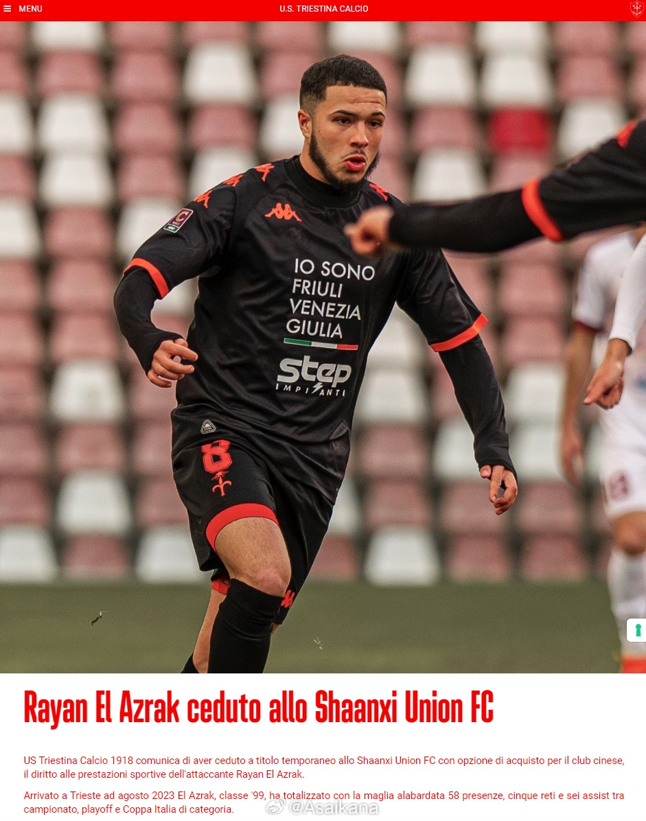 意丙聯(lián)賽球隊(duì)的里雅斯特人(US Triestina)官方宣布,該隊(duì)的荷蘭球員拉揚(yáng)·埃爾阿茲拉克(Rayan El Azrak)以租借并附買斷條款的方式加盟中甲新軍陜西聯(lián)合。埃爾阿茲拉克今年25歲,司職中場(chǎng)/邊鋒。曾在阿賈克斯、烏特勒支等隊(duì)接受青訓(xùn),后效力于芬洛、馬斯特里赫特等隊(duì),2023年夏天加入的里雅斯特人,為該隊(duì)出場(chǎng)58次,打進(jìn)5球。