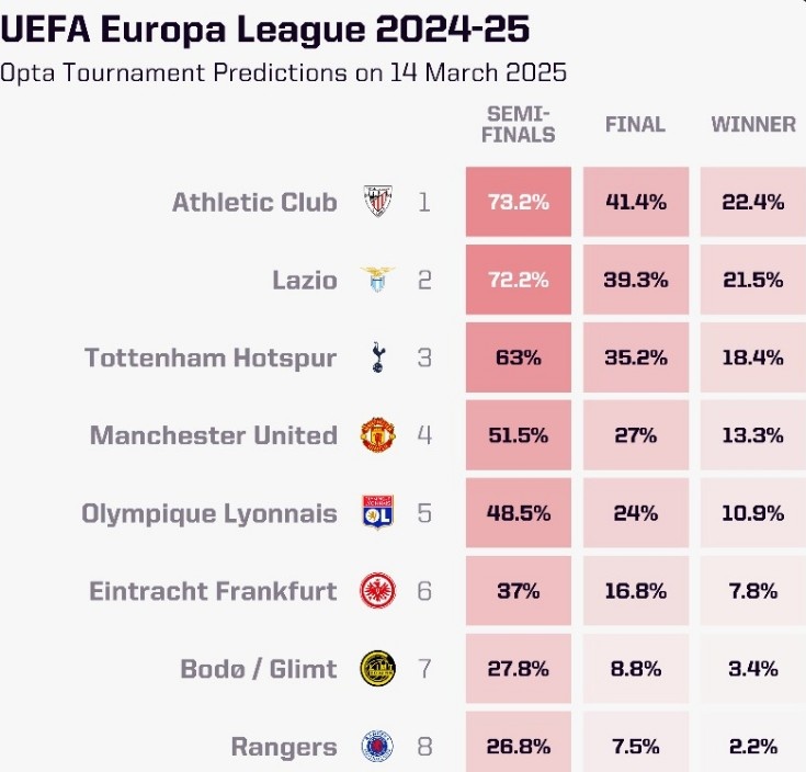 3月14日訊 本賽季歐聯(lián)杯8強產(chǎn)生,數(shù)據(jù)網(wǎng)站OPTA也對本賽季歐聯(lián)杯奪冠概率進(jìn)行了預(yù)測,其中畢爾巴鄂競技最被看好,曼聯(lián)第四。具體如下(三項數(shù)據(jù)依次是晉級半決賽概率、晉級決賽概率、奪冠概率):