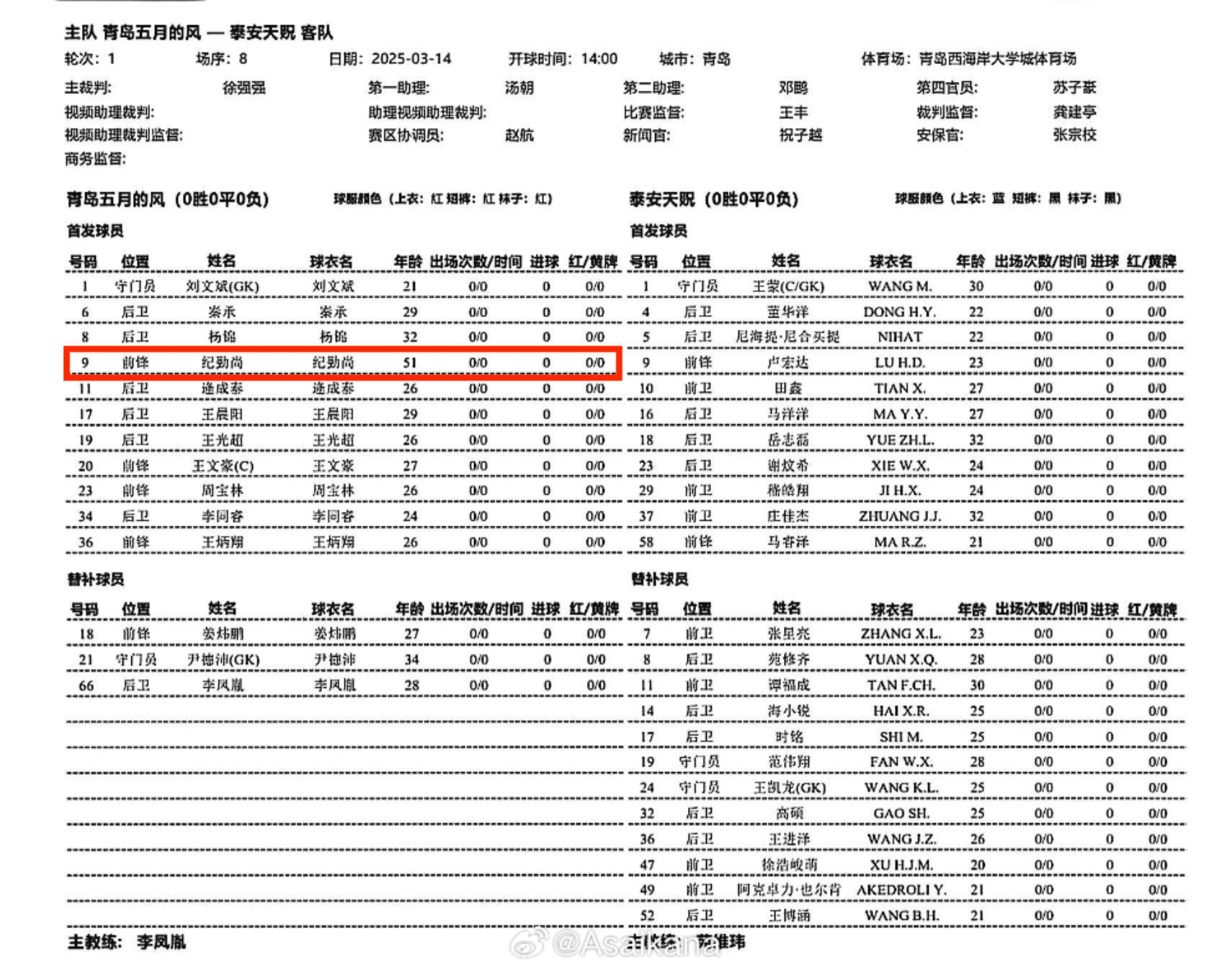 中冠球隊青島五月的風(fēng)將對陣中乙球隊泰安天貺。根據(jù)首發(fā)名單,青島五月的風(fēng)投資人、51歲的紀(jì)勤尚將先發(fā)出戰(zhàn),擔(dān)任前鋒。 ???