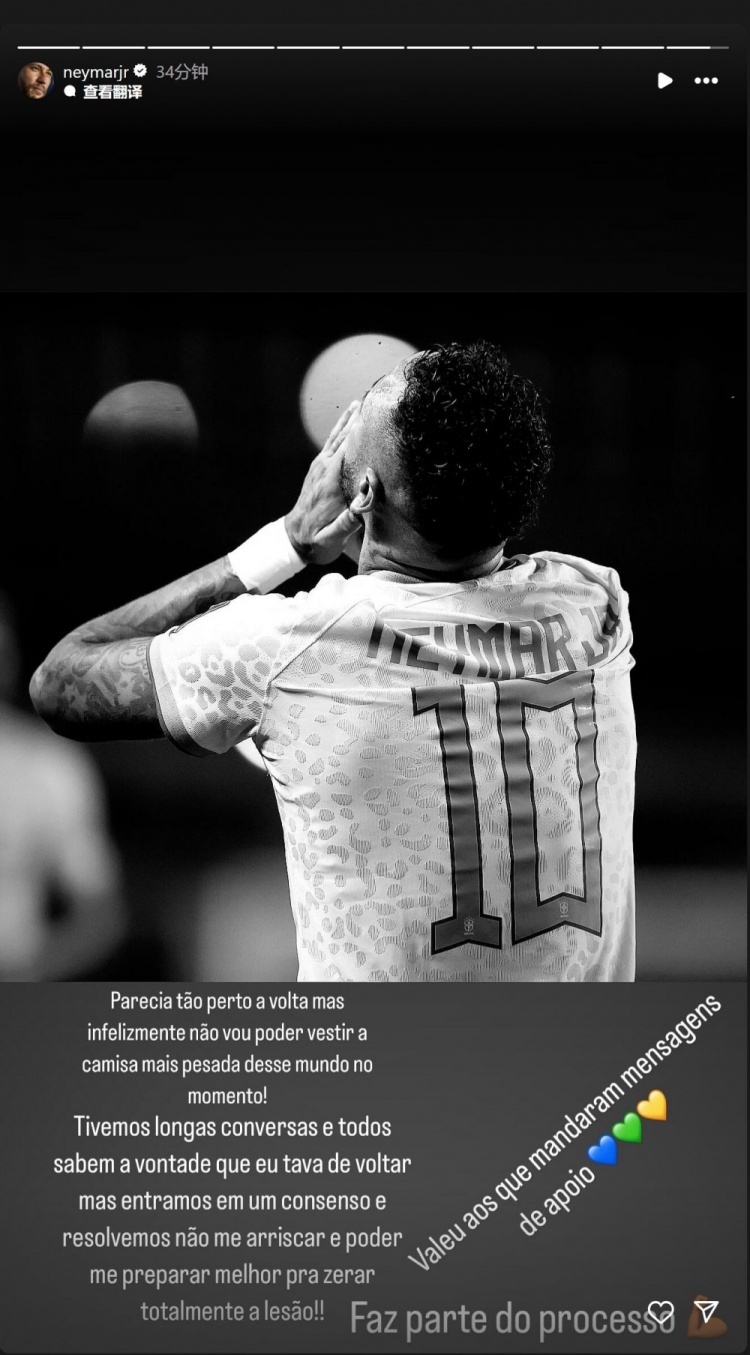 內(nèi)馬爾寫道:“看似回歸近在咫尺,但遺憾的是,目前我還無法穿上這件世界上最具分量的球衣!我們進(jìn)行了長(zhǎng)時(shí)間的交談,大家都知道我渴望回歸的心情,但我們(在溝通后)達(dá)成了共識(shí),決定不冒險(xiǎn),而是更好地做好準(zhǔn)備,等傷病完全痊愈!這是整個(gè)過程的一部分???”