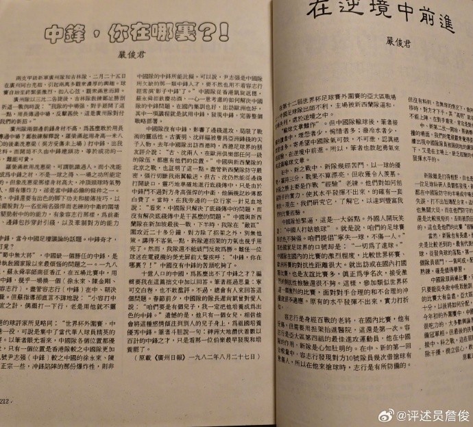 父親說,這些小薄紙片挺“解渴”的。那里肯定也有嚴(yán)俊君老總的“耕耘之作”。我開始工作后,和“足球報(bào)”很多同行成為好友,可惜那時(shí)嚴(yán)總已經(jīng)退居二線,無緣相見。今晚得知他老人家駕鶴西去,心中惆悵。謝謝您!曾經(jīng)帶我們這些球迷去“看世界”……