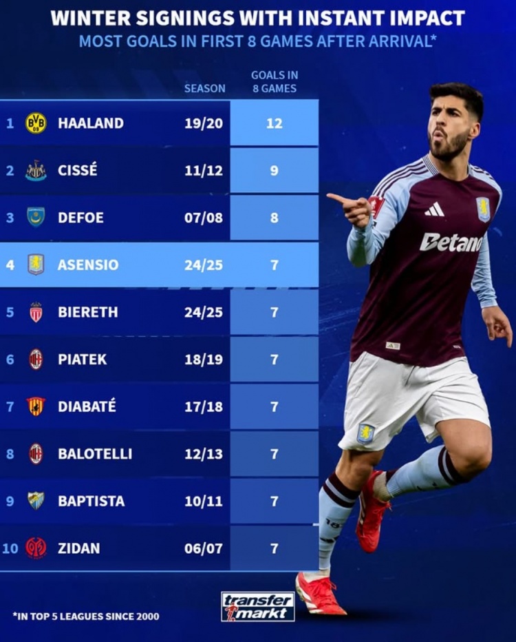 3月15日訊 阿森西奧在冬窗加盟維拉后表現(xiàn)搶眼,各項賽事8場打進7球,數(shù)據(jù)統(tǒng)計顯示這也并列五大聯(lián)賽新世紀(jì)冬窗新援同期進球榜第4位。