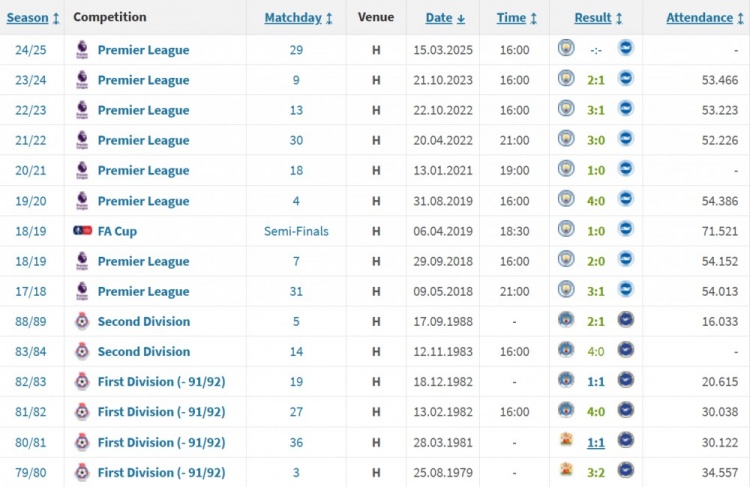 據(jù)德轉(zhuǎn)數(shù)據(jù)統(tǒng)計,歷史上曼城曾在各項賽事14次主場對陣布萊頓,取得12勝2平的戰(zhàn)績,共計打進34球,丟8球。