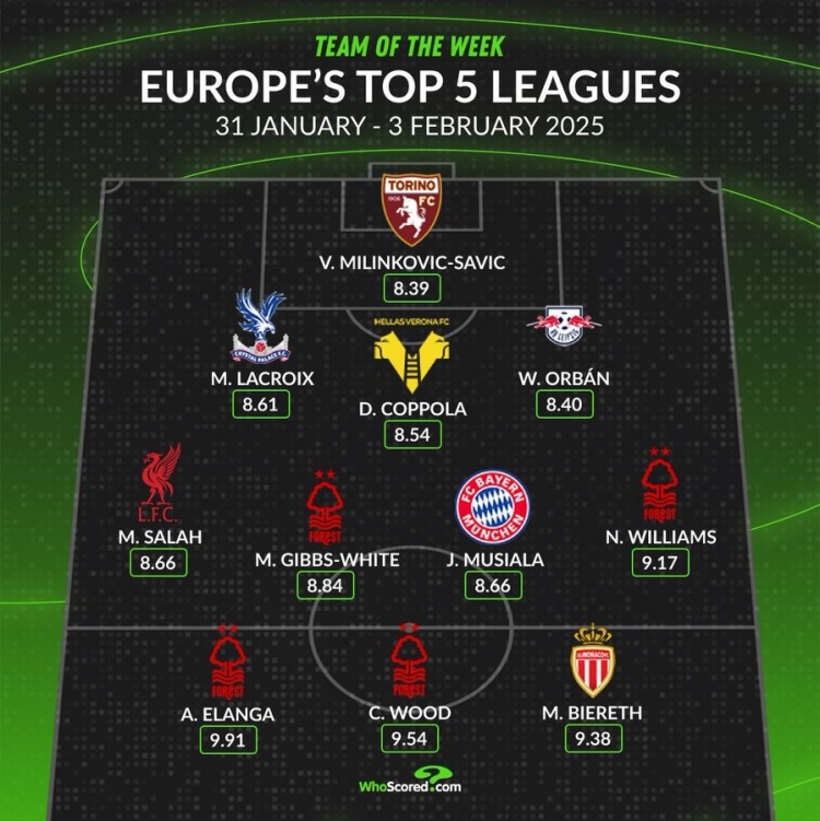 2月5日訊 本周五大聯(lián)賽已經(jīng)完賽,whoscored也統(tǒng)計(jì)了本周評分最佳陣容,諾丁漢森林4將在列。