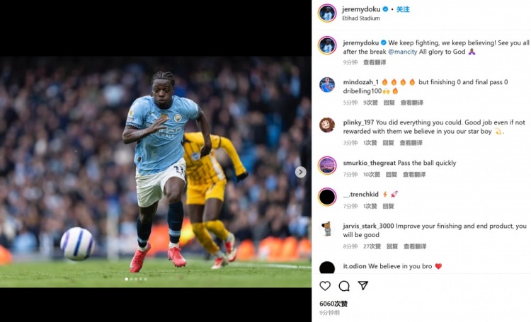 不過(guò)他依然展現(xiàn)出良好心理素質(zhì),在賽后曬出自己的比賽照并鼓勵(lì)道:“我們繼續(xù)戰(zhàn)斗,我們依然堅(jiān)信!和大家在國(guó)家隊(duì)比賽周之后再見(jiàn)!@曼城俱樂(lè)部。榮耀歸于上帝?!?/p>