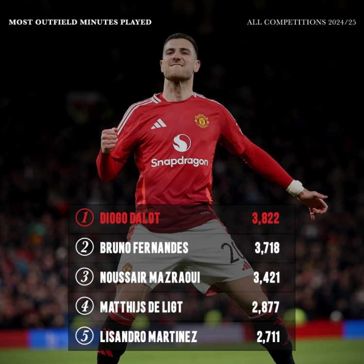 3月16日訊 曼聯(lián)官方統(tǒng)計(jì)了本賽季各項(xiàng)賽事非門將球員的出場時(shí)間,達(dá)洛特壓B費(fèi)居首。