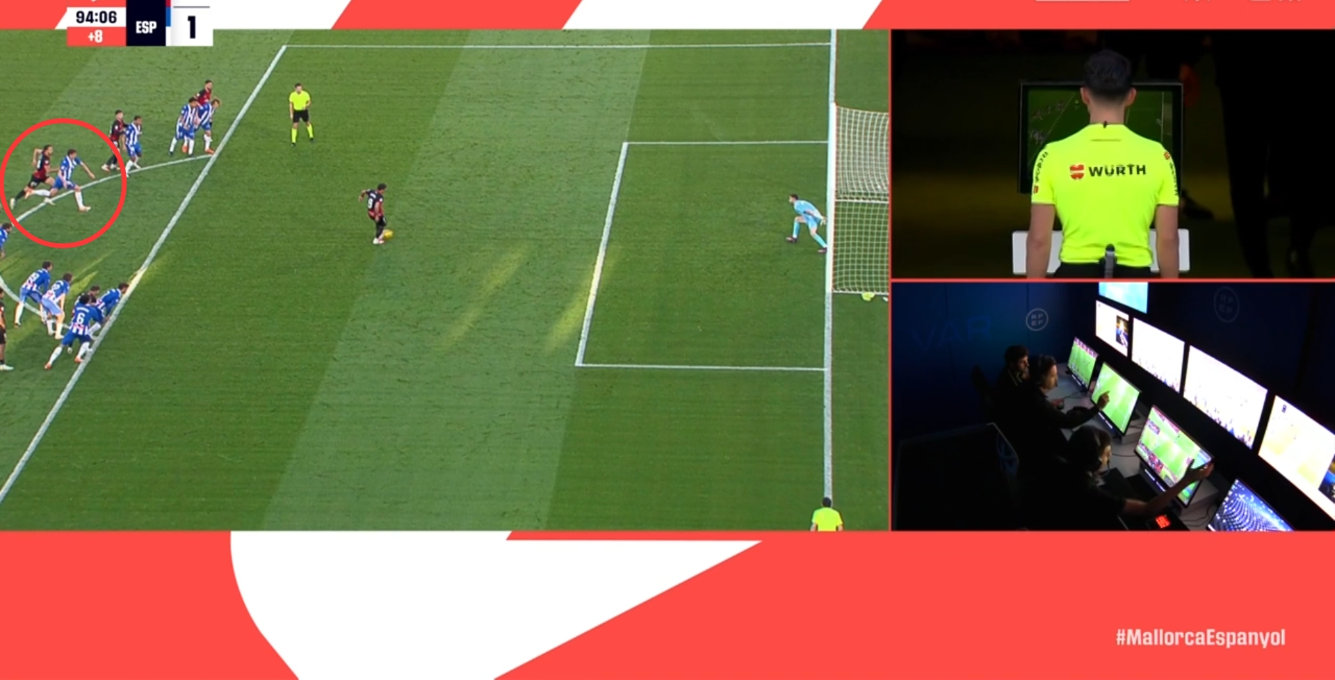 第92分鐘,VAR介入,主裁親自查看回放,此前西班牙人球員和馬略卡球員同時提前進入禁區(qū)?。ň嚯x點球點不滿9.15米),并對比賽產(chǎn)生影響,主裁判罰點球重罰↓