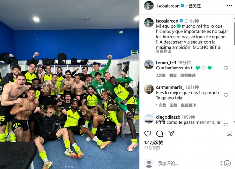 本場(chǎng)比賽伊斯科點(diǎn)射破門拉響反擊號(hào)角,賽后伊斯科也在社媒曬出更衣室內(nèi)全隊(duì)球員慶祝合影,配文寫道:“我的球隊(duì)????我們做到的事情值得被認(rèn)可,永不放棄太重要了。這是一場(chǎng)團(tuán)隊(duì)的勝利,現(xiàn)在是時(shí)候休息調(diào)整,以最高昂的斗志繼續(xù)前進(jìn)。貝蒂斯加油!”