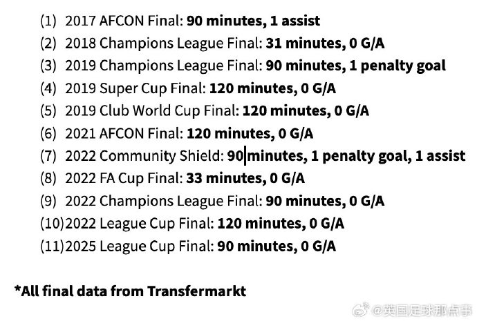 Transfermarkt:薩拉赫至今已代表俱樂部和國家隊(duì)參加了11場(chǎng)決賽,累計(jì)出場(chǎng)約1000分鐘,但從未打入非點(diǎn)球進(jìn)球。