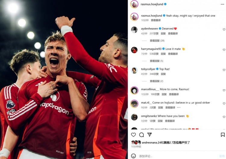 本場進(jìn)球的霍伊倫也終結(jié)了自己連續(xù)21場進(jìn)球荒,賽后他在社媒曬出與隊(duì)友慶祝進(jìn)球的合影,配文寫道:“好吧,我承認(rèn)喜歡這種感覺?!?/p>