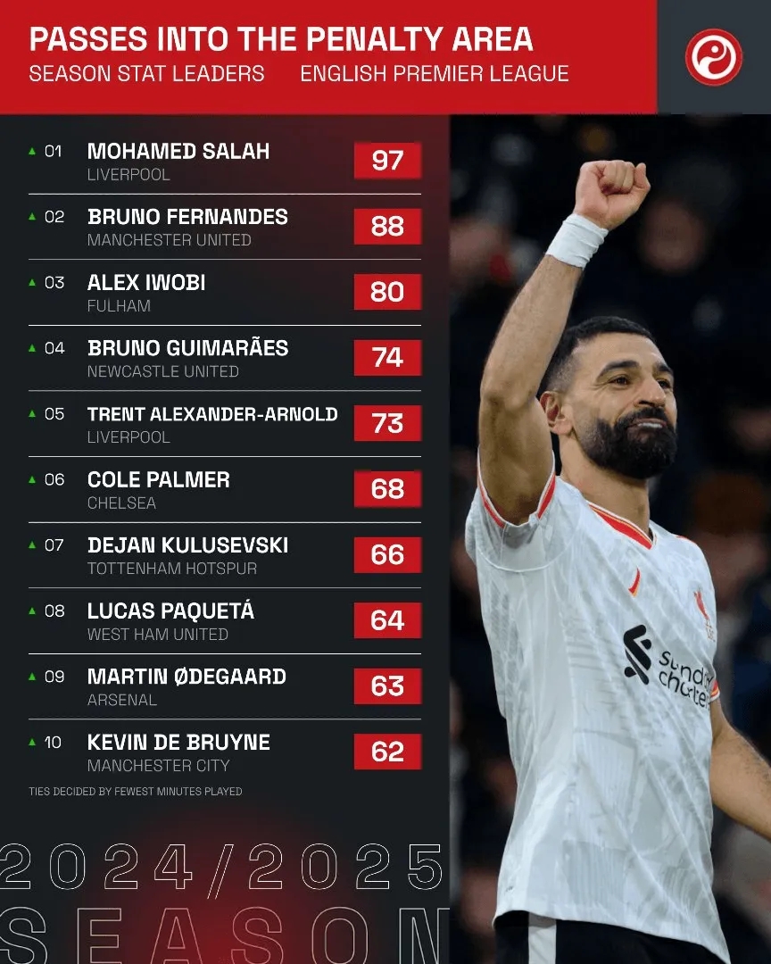 2月5日訊 squakwa統(tǒng)計(jì)了本賽季英超球員傳球進(jìn)入禁區(qū)次數(shù)情況,薩拉赫力壓B費(fèi)居首。