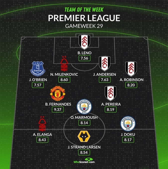 后衛(wèi):奧布萊恩(埃弗頓,7.57分)、米倫科維奇(諾丁漢森林,8.60分)、約西姆-安德森(富勒姆,7.63分)、羅賓遜(富勒姆,8.20分)