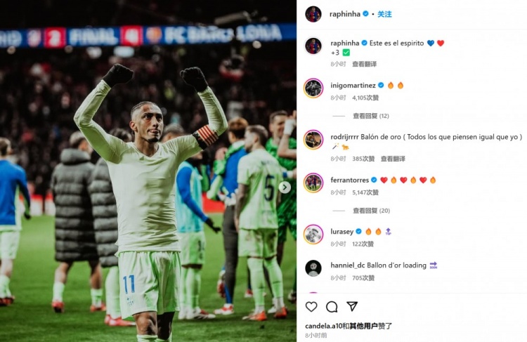 拉菲尼亞也曬出自己賽后振臂慶祝照,并配文:“ 這就是意志力??????再添3分 ?”