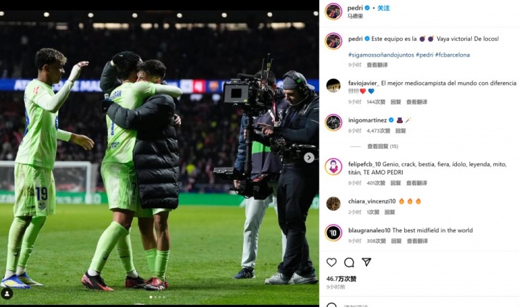 佩德里也曬出自己和隊友的相擁慶祝照,并配文:“這支球隊????????(狀態(tài)火爆),多么棒的勝利!太瘋狂了!”