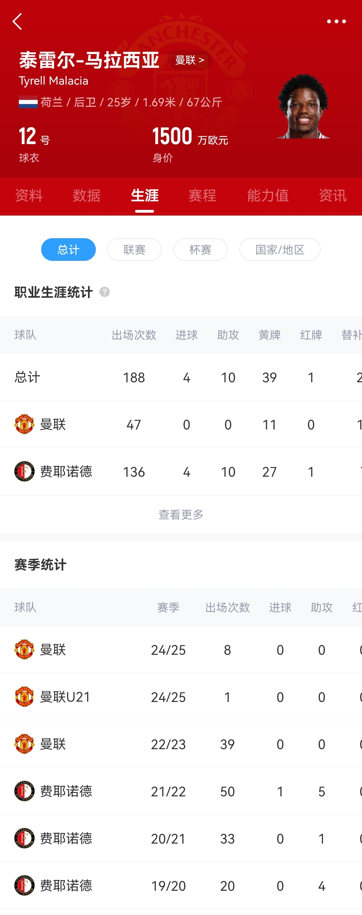 馬拉西亞是滕哈赫?qǐng)?zhí)教期間1500萬歐元從費(fèi)耶諾德簽下的,但加盟以后受傷病和適應(yīng)問題的困擾,2年半總共只為曼聯(lián)出場(chǎng)47次。