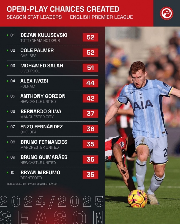 本賽季英超運動戰(zhàn)創(chuàng)造機會榜:庫盧&帕爾默52次,薩拉赫51次