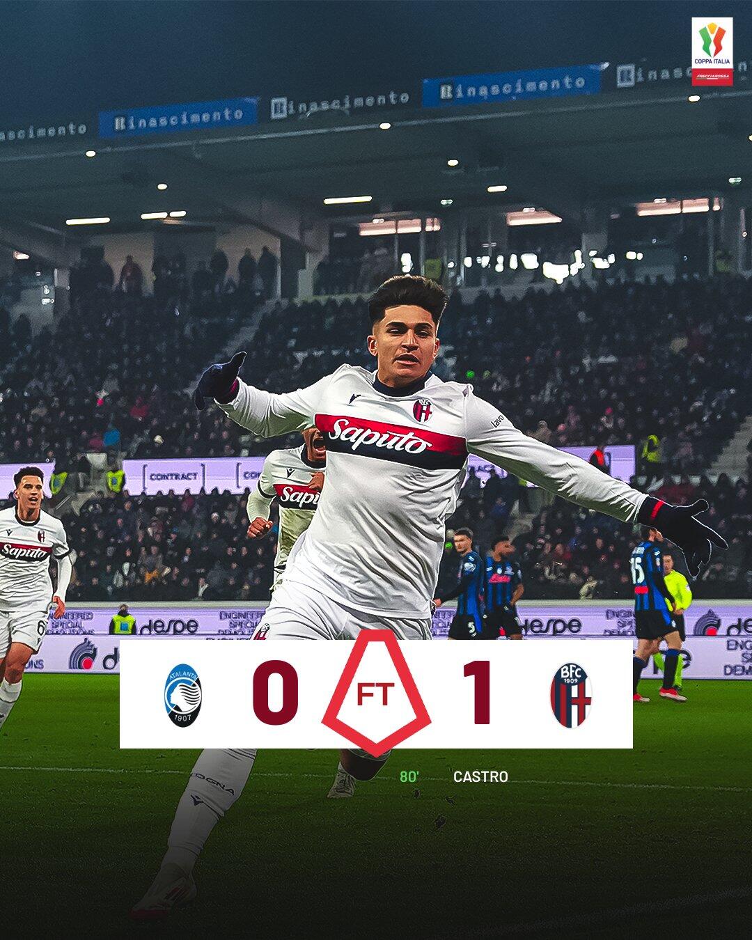 意大利杯1/4決賽,博洛尼亞1-0擊敗亞特蘭大晉級(jí)四強(qiáng)。上半場(chǎng),雙方均無建樹;下半場(chǎng),直到第80分鐘,替補(bǔ)登場(chǎng)的卡斯特羅一擊制勝。