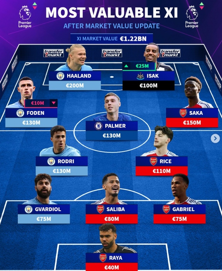 3月19日訊 《轉(zhuǎn)會市場》更新了英超球員身價,并列出了英超最新身價最貴陣容,曼城和阿森納共計9席。