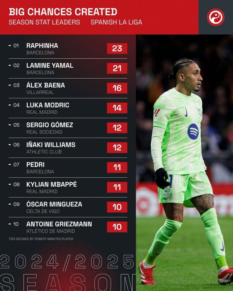 本賽季西甲創(chuàng)造重大機(jī)會(huì)榜: