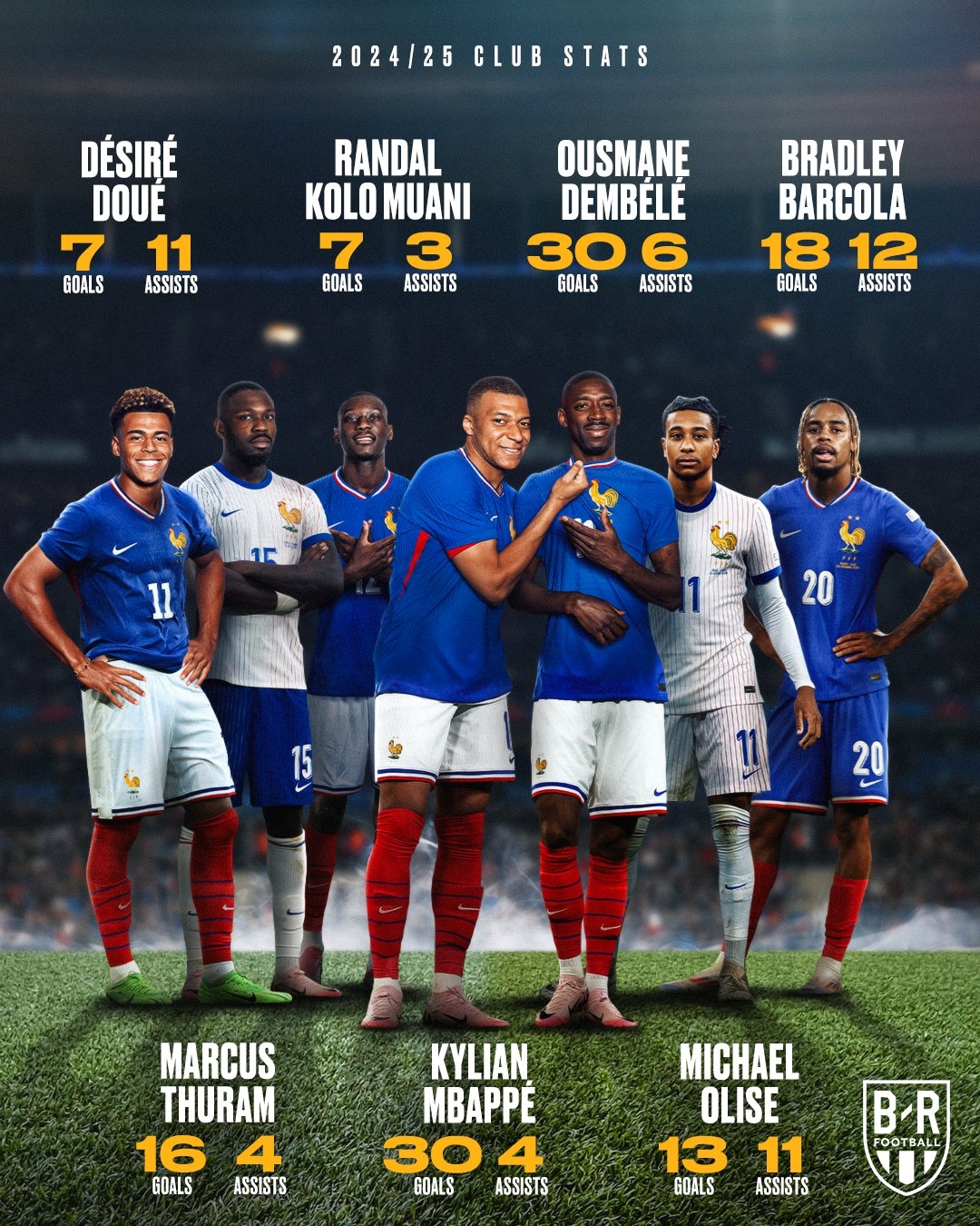 本賽季到目前為止,法國隊(duì)7名進(jìn)攻球員(杜埃、穆阿尼、登貝萊、巴爾科拉、小圖拉姆、姆巴佩、奧利賽)的統(tǒng)計(jì)數(shù)據(jù)為: