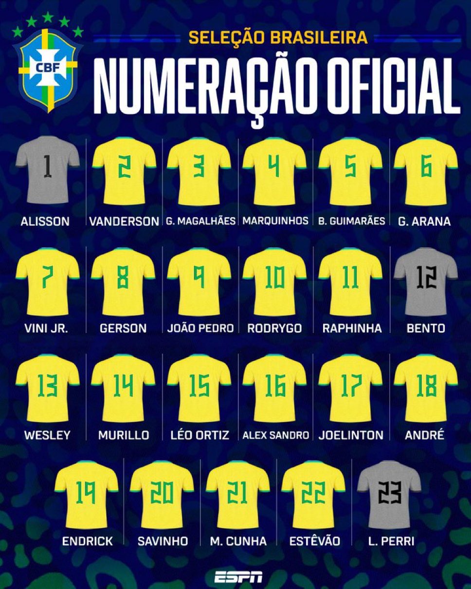 前鋒:22-埃斯特旺(帕爾梅拉斯)、9-若昂-佩德羅(布萊頓)、7-維尼修斯(皇馬)、10-羅德里戈(皇馬)、11-拉菲尼亞(巴薩)、20-薩維尼奧(曼城)、19-恩德里克