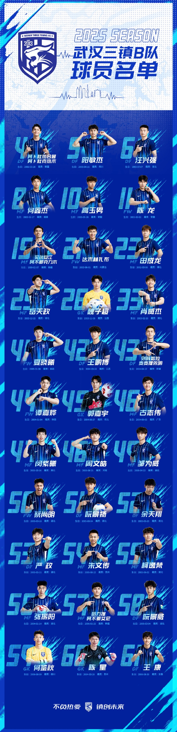 新賽季中乙聯(lián)賽開(kāi)戰(zhàn)在即,身披上賽季U21聯(lián)賽冠軍的榮光,武漢三鎮(zhèn)B隊(duì)即將踏上嶄新的戰(zhàn)場(chǎng)。讓我們跟隨名單去認(rèn)識(shí)各位隊(duì)員,感受來(lái)自三鎮(zhèn)的青春力量!
